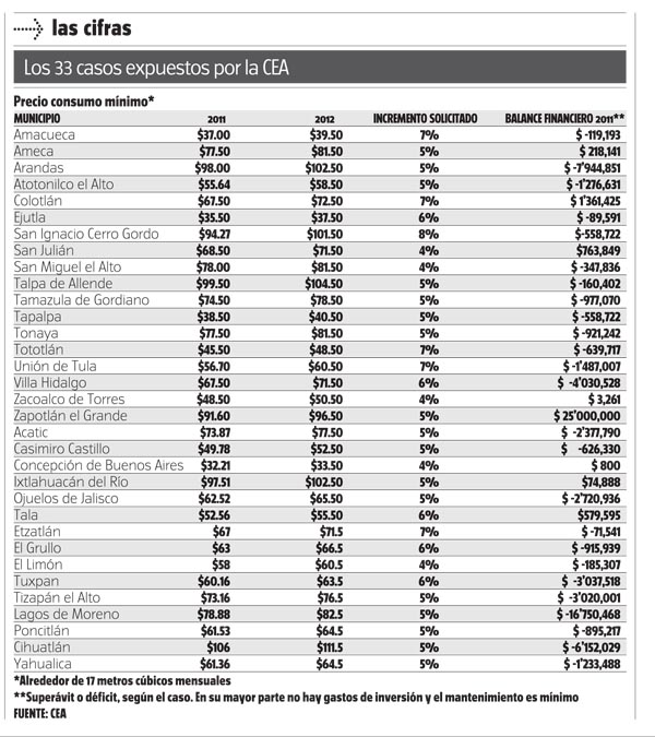 La CEA elaboró propuestas tarifarias para 2012 en 33 municipios, que incluían alzas de entre 4 y 8 por ciento (ver gráfico anexo), con base en su situación específica. No es lo mismo sacar el agua a seis metros, como en Cihuatlán, que a 70, como en Los Altos. Además, los costos de la potabilización varían según la calidad de la fuente de abastecimiento. Sin embargo, ninguna la aprobó el Congreso.